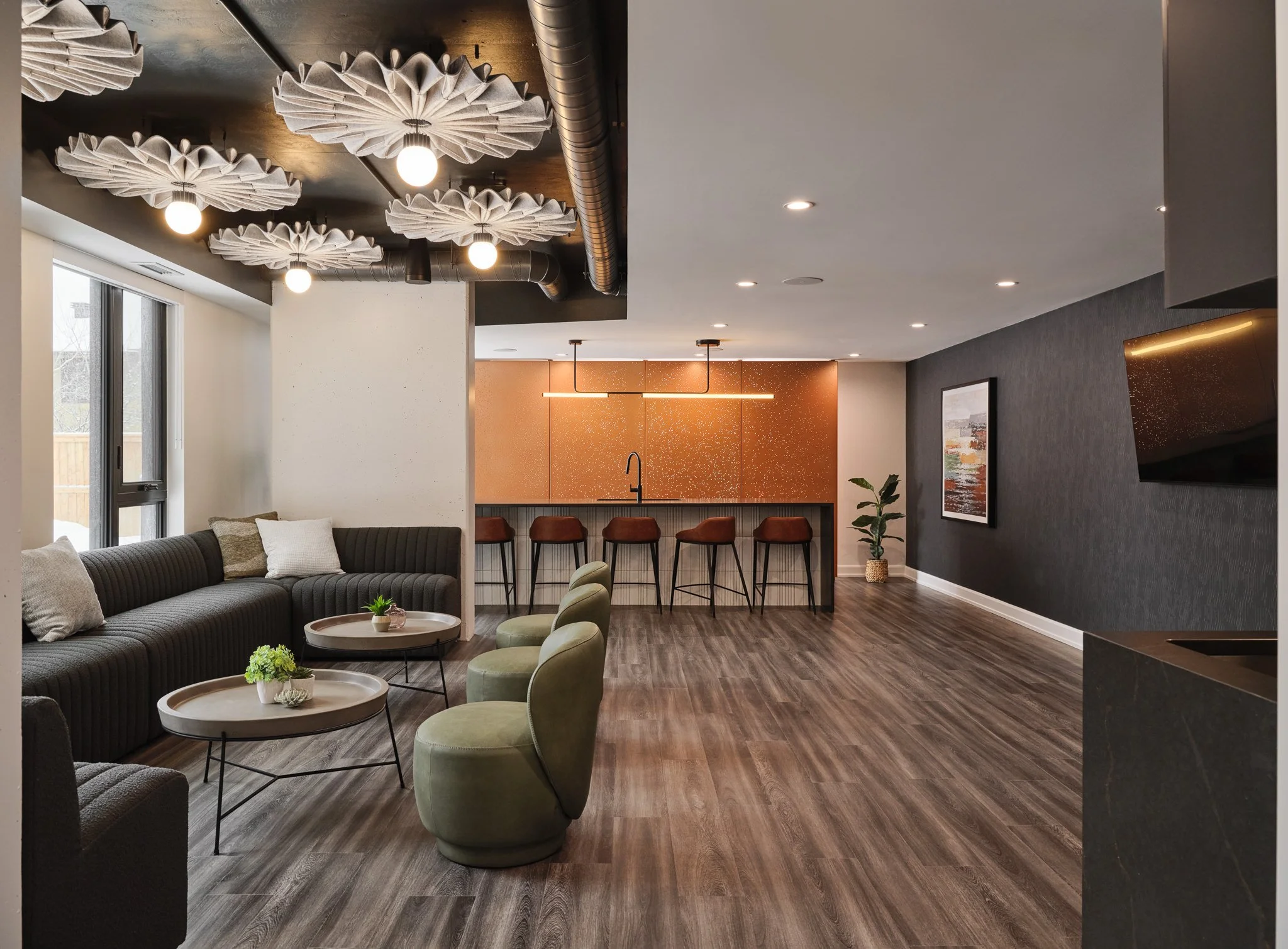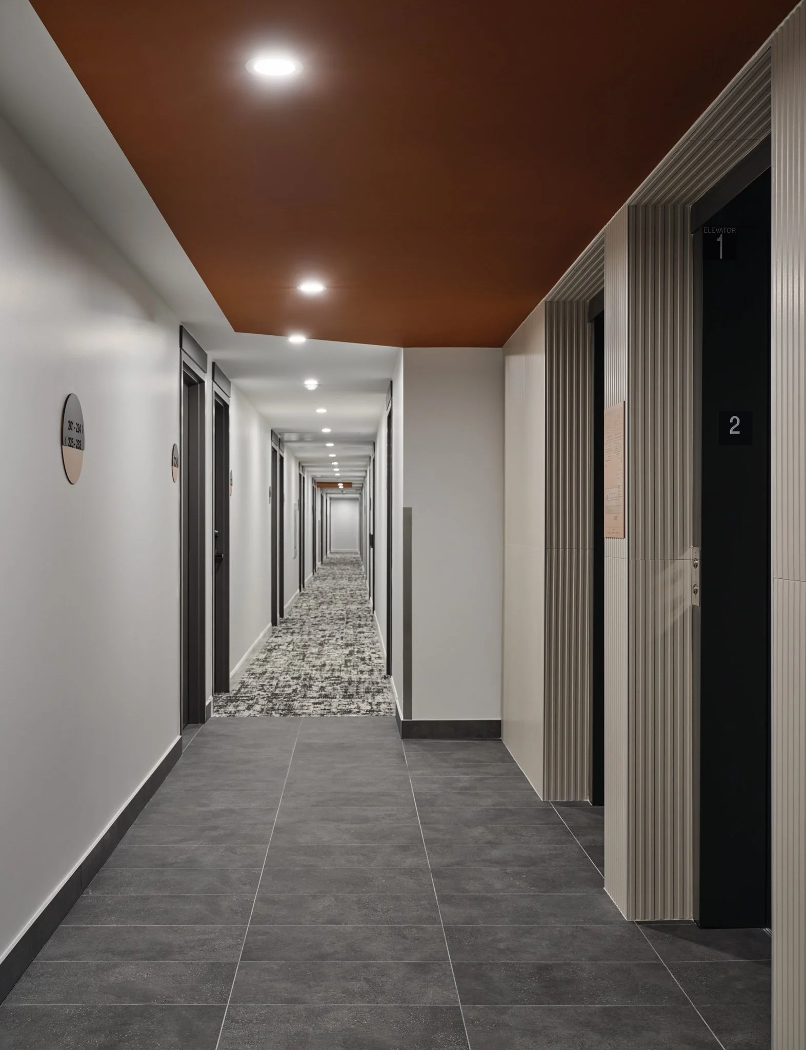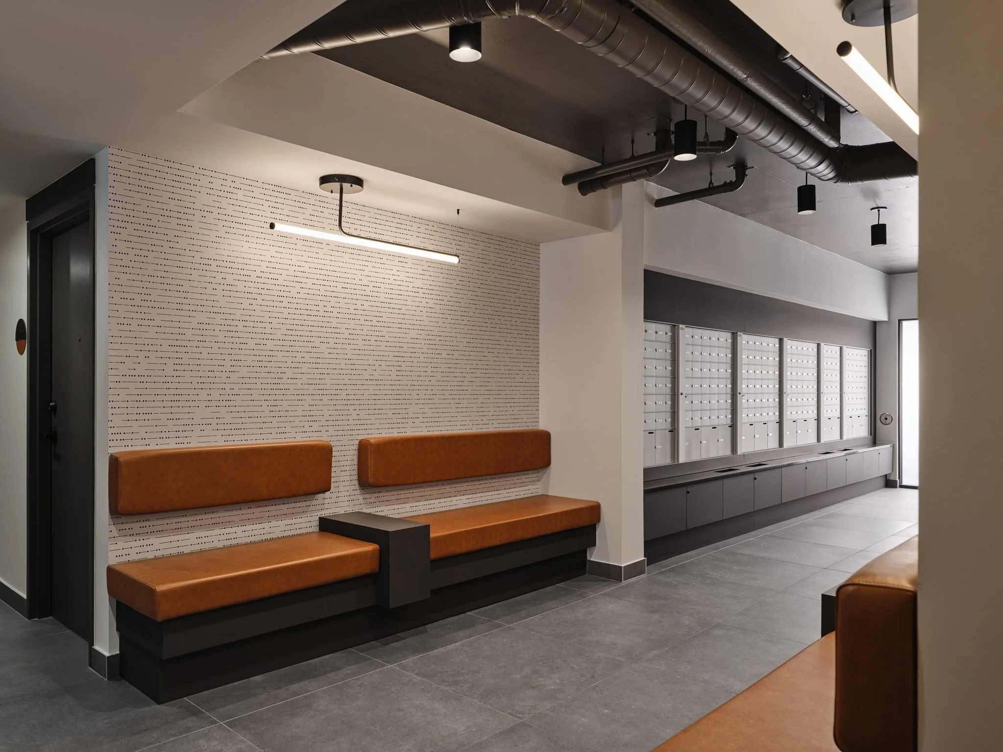 // The design of the public realm was focused on creating an engaging built form and façade treatment that animates the street frontage. Dark elements climb the façade in a playful way creating rhythm and variation along the east elevation while also allowing the building to step back from the street on the upper levels.